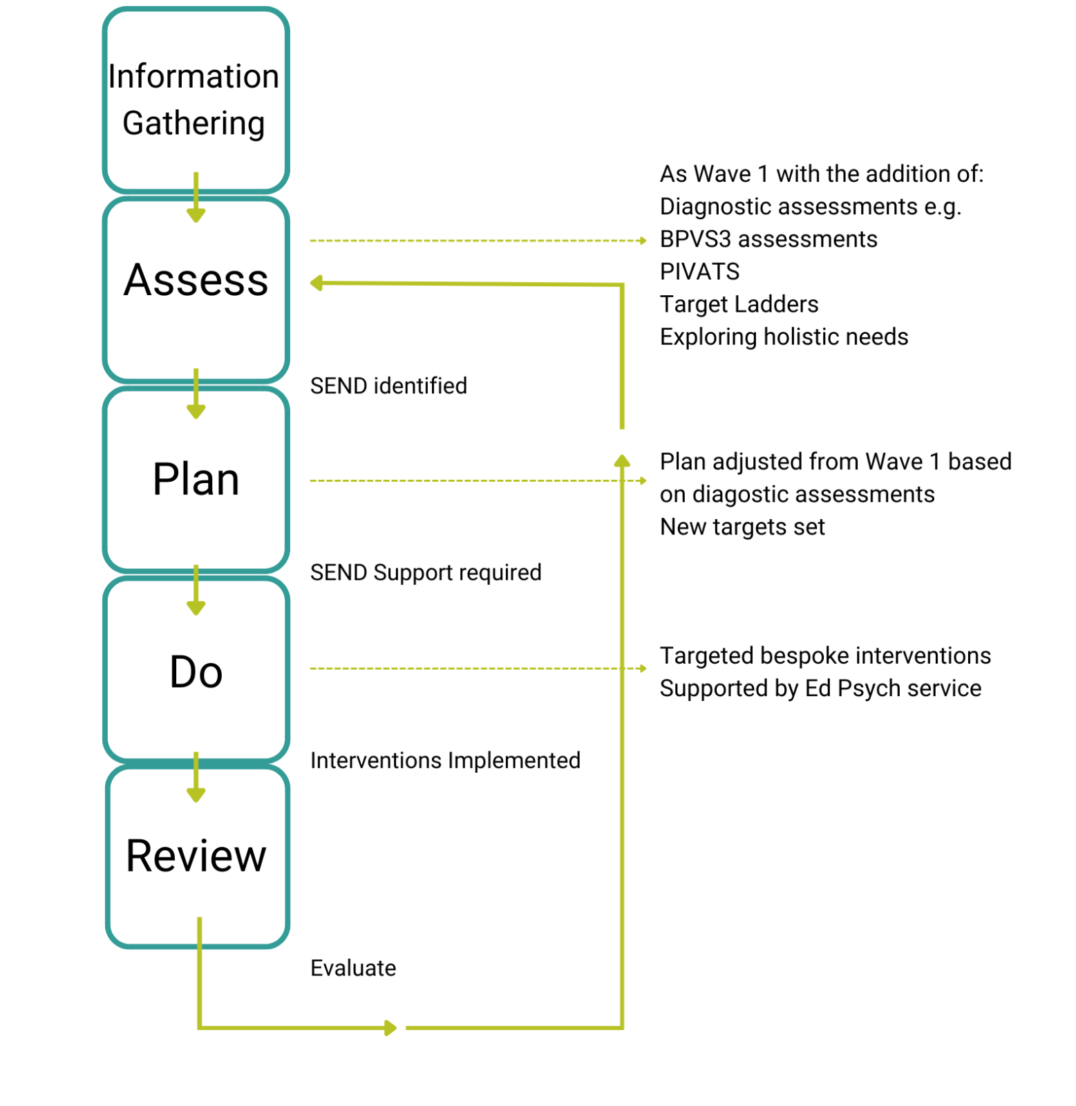 Where initial Wave 1 interventions have not secured desired impact, assessment will be moved to Wave 2. This wave allows access to more bespoke and specific specialist interventions based on targeted assessments undertaken at the beginning of the cycle.